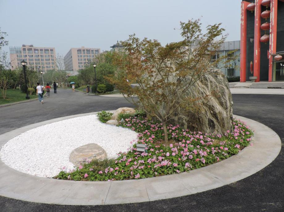 南門入口處(chù)設置環島,放置泰山石一塊,泰山石紋理(lǐ)自然,配置(zhì)白石子和天竺葵,並配置紅楓點(diǎn)景。